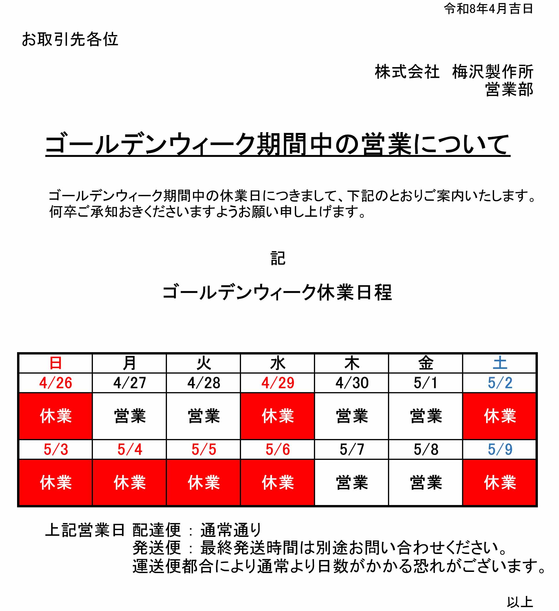 GW休暇の案内をUPしました
